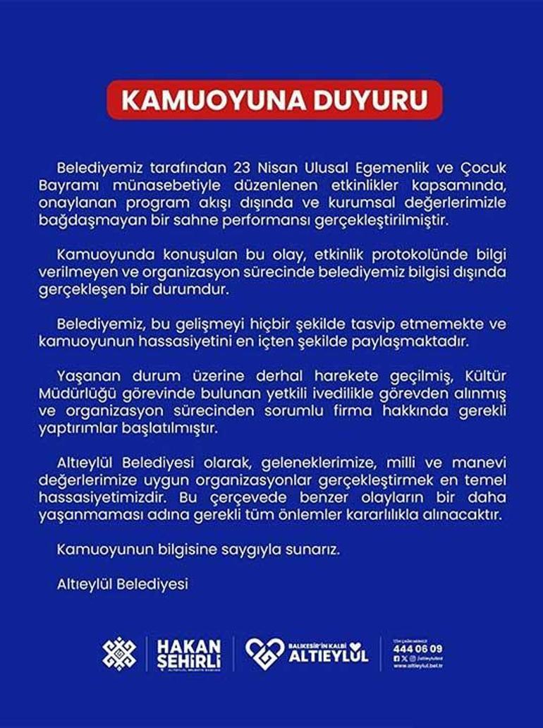 Altıeylül Belediyesi tarafından bahisle ilgili yapılan açıklamada ise “Belediyemiz tarafından 23 Nisan Ulusal Egemenlik ve Çocuk Bayramı münasebetiyle düzenlenen etkinlikler kapsamında, onaylanan program akışı dışında ve kurumsal değerlerimizle bağdaşmayan bir sahne performansı gerçekleştirmiş. Kamuoyunda konuşulan bu olay, aktiflik protokolünde bilgi verilmeyen ve tertip sürecinde belediyemiz bilgisi dışında gerçekleşen bir durumdur. Belediyemiz, bu gelişmeyi hiçbir formda tasvip etmemekte ve kamuoyunun hassasiyetini en içten formda paylaşmaktadır. Yaşanan durum üzerine derhal harekete geçilmiş, Kültür Müdürlüğü vazifesinde bulunan yetkili acilen misyondan alınmış ve tertip sürecinden sorumlu firma hakkında gerekli yaptırımlar başlatılmıştır. Altıeylül Belediyesi olarak, geleneklerimize, ulusal ve manevi kıymetlerimize uygun tertipler gerçekleştirmek en temel hassasiyetimizdir. Bu çerçevede emsal olayların bir daha yaşanmaması ismine gerekli tüm tedbirler kararlılıkla alınacaktır. Kamuoyunun bilgisine hürmetle sunarız” denildi.