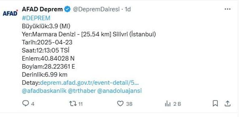 İstanbul’da hissedilen bir zelzele meydana geldi. AFAD’dan yapılan açıklamada zelzelenin büyüklüğünün 3.9 olduğu kaydedildi. Kandilli’den de zelzeleye ait bir açıklama geldi. Kandilli de sarsıntının büyüklüğünü 4 olarak belirtti.